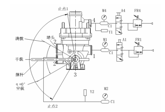 打開控制閥 A1、A4,從被測(cè)樣品進(jìn)氣口、控制口充氣至 PE+50 0 。驅(qū)動(dòng)操縱裝置使被測(cè)樣品擺桿從止點(diǎn) 2 緩慢轉(zhuǎn)動(dòng)至止點(diǎn) 1,同時(shí)記錄出氣口輸出氣壓隨擺桿角位移變化的關(guān)系曲線。若采用非連續(xù)記錄方法, 擺桿角位移的最大測(cè)量間隔應(yīng)不大于 2°。?