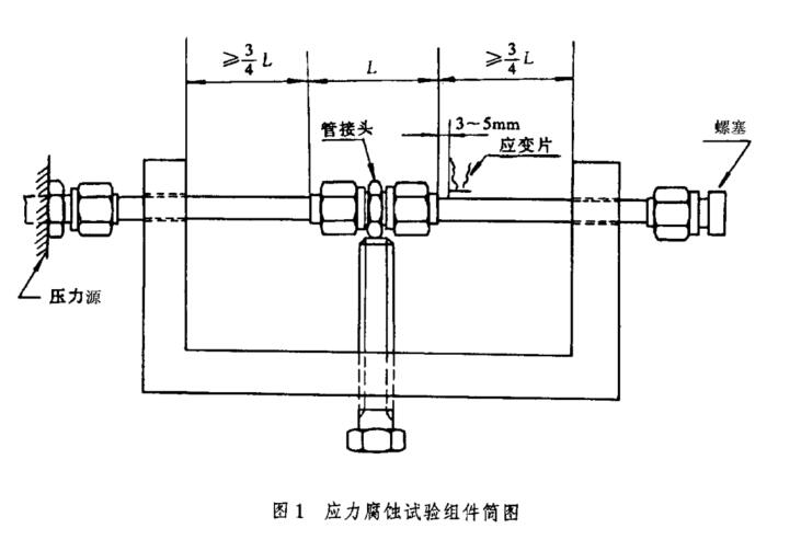 該項(xiàng)試驗(yàn)用于檢驗(yàn)導(dǎo)管與接頭之間的連接形式對連接部位是否會產(chǎn)生有害應(yīng)力腐蝕。將試驗(yàn)樣件裝在試驗(yàn)裝置中(見圖1),試驗(yàn)裝置在導(dǎo)管、接頭組件接口處施加一相當(dāng)于管材最小屈服強(qiáng)度(85±5)%的彎曲應(yīng)力。在不取消彎曲應(yīng)力的情況下,管內(nèi)充系統(tǒng)工作壓力。浸人溫度為90±5℃,濃度為6%的 NaC 溶液中, Smin 后倒出,放在60±5℃的空氣中干燥2Smine重復(fù)上述試驗(yàn),200次后,放壓、清洗、分解,用10倍放大鏡檢查各連接件連接處表面不應(yīng)有裂紋和凹坑,連接件處縱向和橫向截面的金相組織不應(yīng)出現(xiàn)晶間腐蝕。