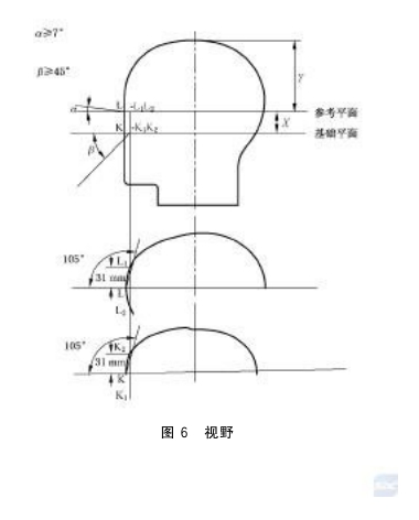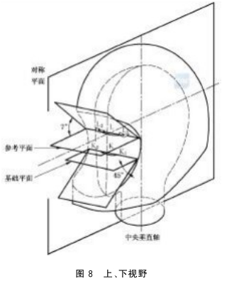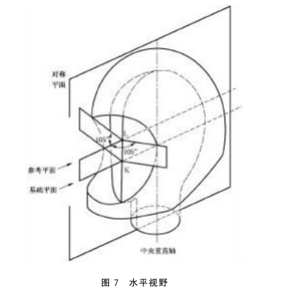 a )左右視野(水平視野): 二面角 的兩個部分與頭型對稱平面成對稱關系并位于參考面與基礎面之間, 這些二面角 均由 頭型對稱平面與對稱平面形成的角 度不小于 105° 的垂直面構成, 其邊就是直線 LK , 如圖 6 視野和圖 7 水平視野所示;