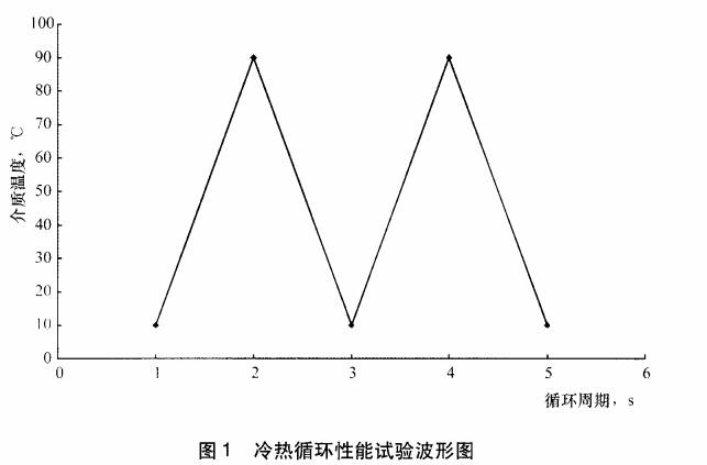 將散熱器內(nèi)部通人50%的乙二醇和50%的水(體積比),商用車散熱器施加以100kPa土20kPa的壓力,乘用車散熱器施加以150kPa士20kPa的壓力進行2000次109-90C--10C溫度交變循環(huán).(見圖1所示) , 循環(huán)頻率為3~ 15次每小時, 溫度控制精度為士3C。試驗后按規(guī)定進行密封性能檢測。