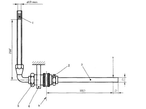 1 將接頭總成裝入試驗裝置中。以試驗液體(見6.2)注入試驗裝置至750mm的液柱高度。在距離鎖定裝置的測量棒的軸線為10D處,施加50N載荷垂直于接頭中心線,見下圖。D等于GB/T2351中的軟管公稱內(nèi)徑。