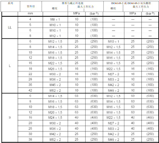 1按照ISO8434本部分由碳鋼制造的接頭要滿足或超出真空6.5kpa(0.065bar)絕對壓力到表1